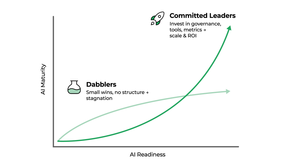 Dabblers test AI without dedicated budgets or clear goals. They may achieve small wins, but progress remains slow. Committed leaders, in contrast, take systematic steps. They invest in talent, tools, and governance. They also measure progress with defined metrics.