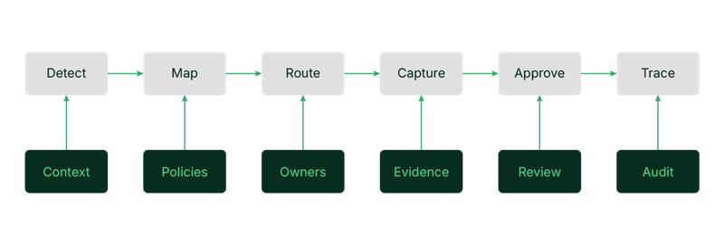 A scalable AI compliance automation platform follows a model that looks like this: Detect – Identify policy changes or decisions that may trigger regulatory or platform requirements.
