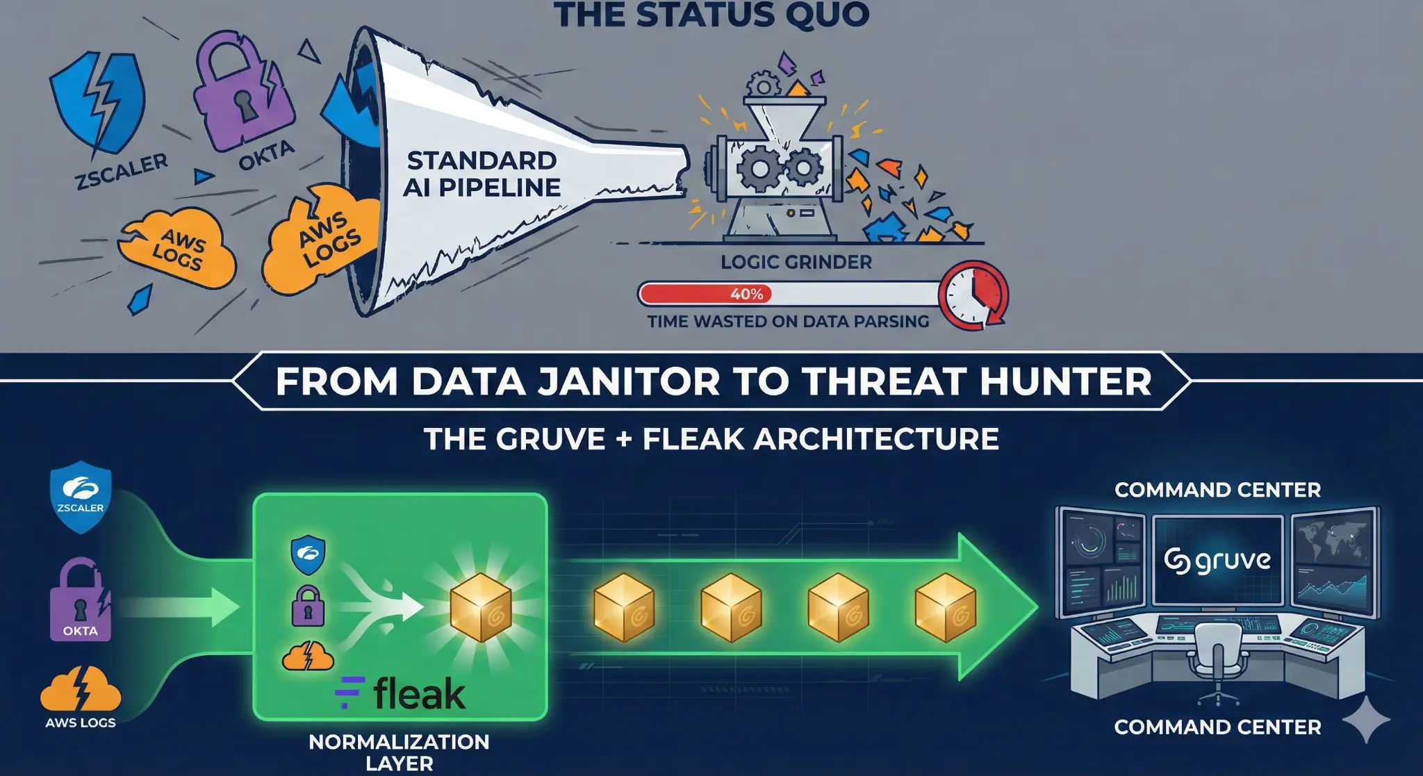 Standard pipelines waste 40% on “logic grinding.” The Gruve + Fleak architecture ends the janitor work. With Fleak’s Normalization Layer, raw logs from Zscaler and Okta become actionable intelligence in the Gruve Command Center.