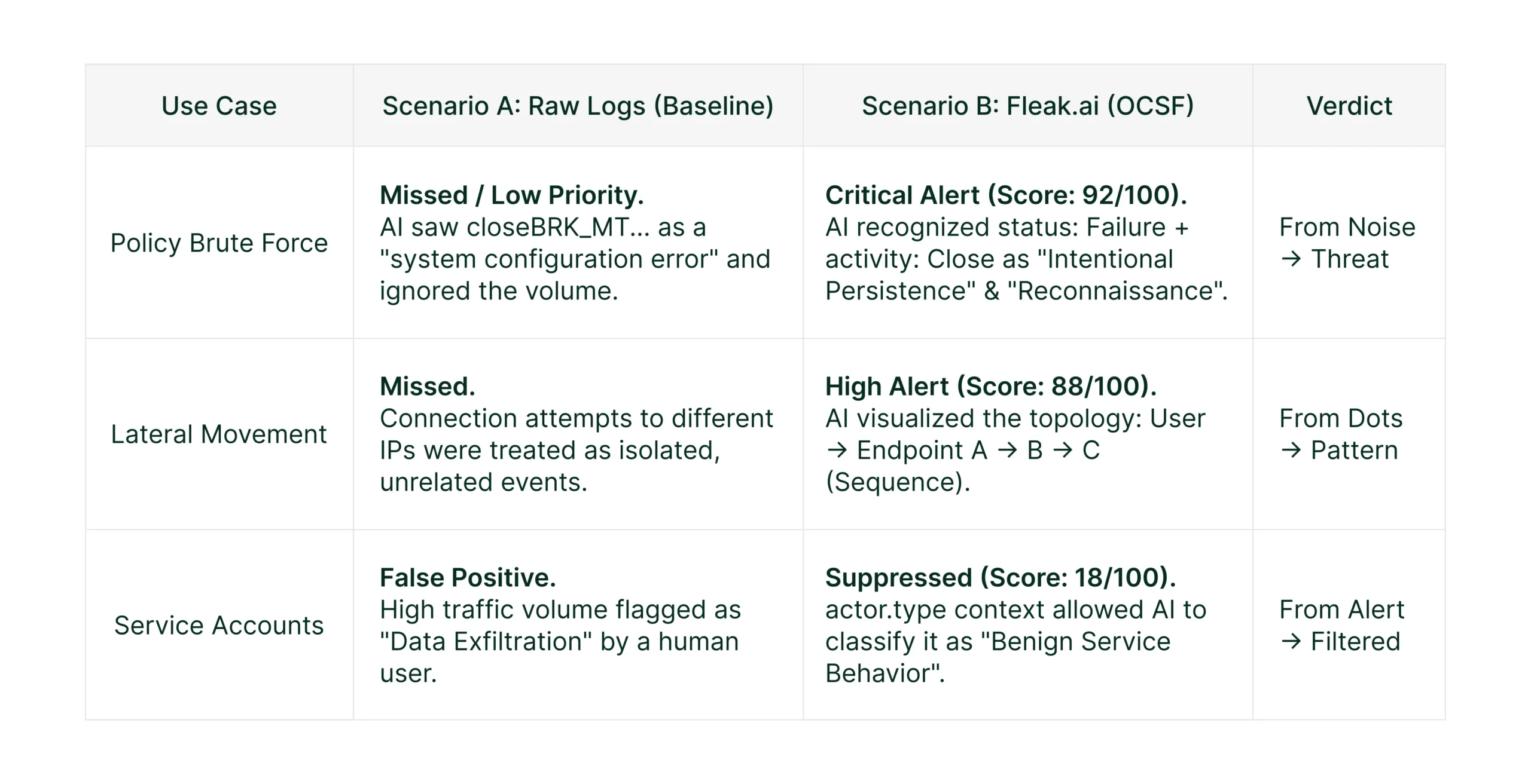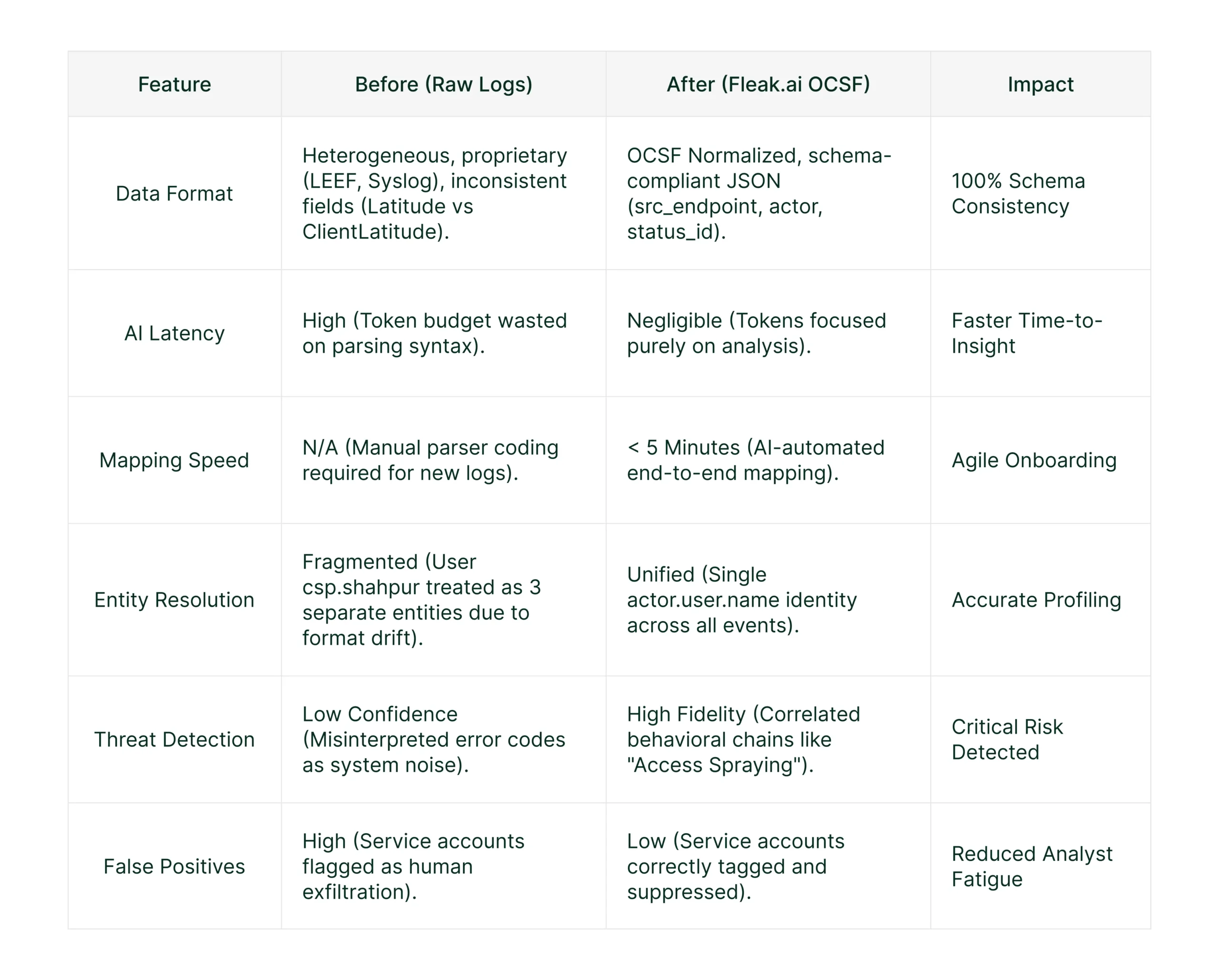 The Conclusion: Data normalization is the primary catalyst for maximizing AI reasoning. The test demonstrated that while the Gruve AI-powered SOC engine is highly capable of processing raw logs, feeding it Fleak.ai-normalized OCSF allowed the model to bypass the “parsing phase” and move immediately to “high-fidelity analysis.” This resulted in a shift from standard alert generation to the identification of complex, multi-stage threat patterns—achieving a Tier 3 Hunter performance profile without increasing operational latency or token costs.