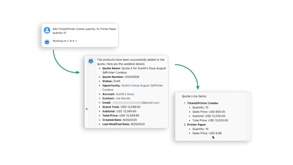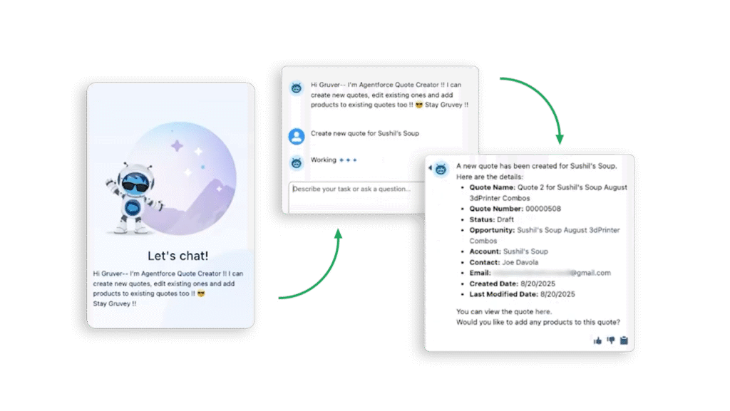 In Gruve’s demonstration, the process began with nothing more than a dashboard. No account page. No opportunity record. From there, Gruve generated a quote for a client. They needed to order several 3D printers and supporting materials, such as filament and printer paper. Instead of navigating through traditional records, Gruve entered the account name, product names, and quantities. Within moments, the agent offered a complete quote.
