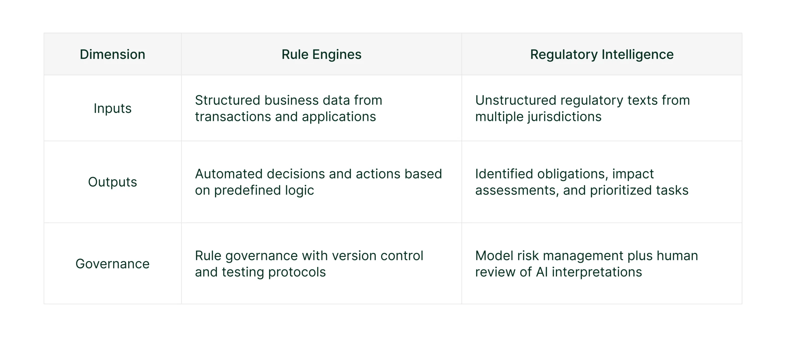 It is helpful to compare these two systems directly. They handle different parts of the compliance journey: A rule engine is your “execution” layer, while regulatory intelligence is your “sensing” layer. One acts while the other thinks. Most large firms now realize they need both to succeed.